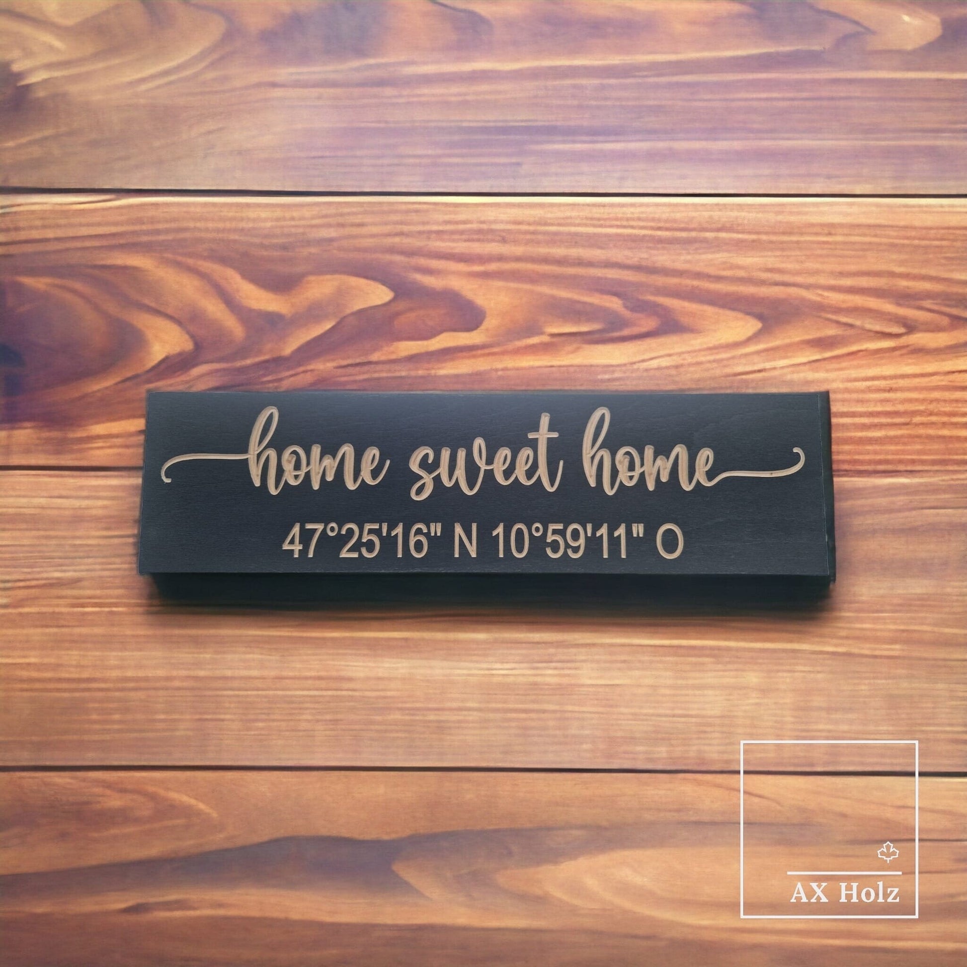 Wanddekoration, Holzschild in vielen Variationen für Paare, Zuhause und mehr. Mit individuellen Koordinaten als echte Gravur.