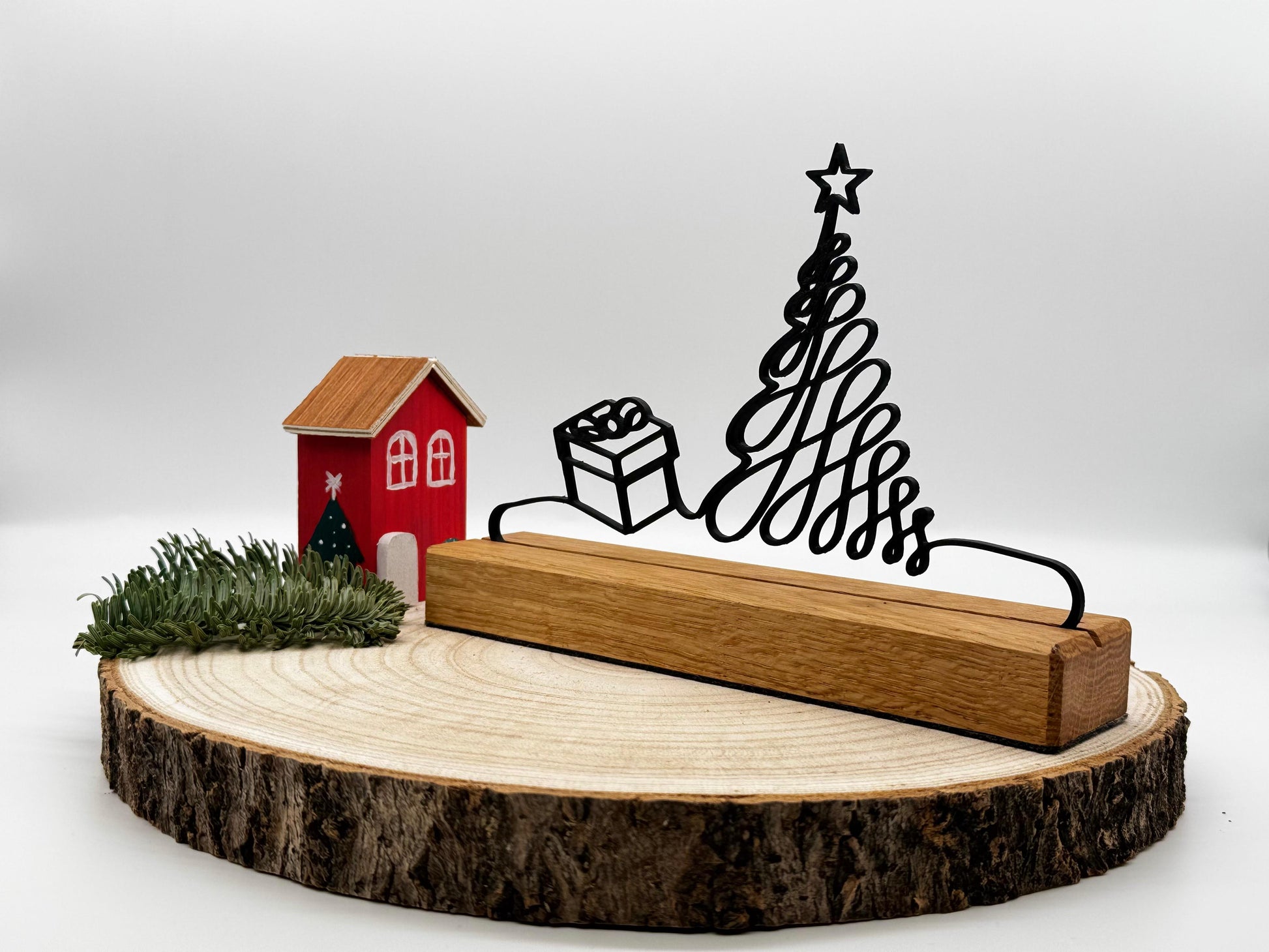 Der massiv gefertigte Sockel aus geölter Eiche sorgt für eine warme, natürliche Optik, während die schwarze Silhouette mit Geschenk und geschwungenem Weihnachtsbaum einen modernen und zugleich festlichen Akzent setzt. Durch das schlichte Design lässt sich das Deko-Element wunderbar in verschiedenste Wohnstile integrieren – ob klassisch, modern, skandinavisch oder minimalistisch.